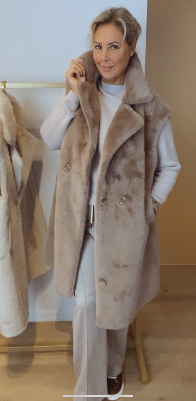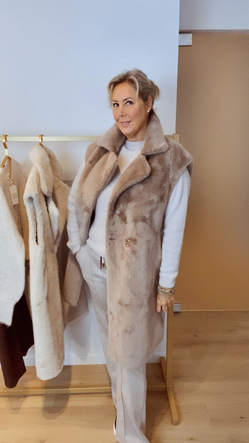 Deze prachtige faux fur, superzachte mouwloze jas combineert moeiteloos stijl en comfort – een echte eyecatcher voor elke gelegenheid!