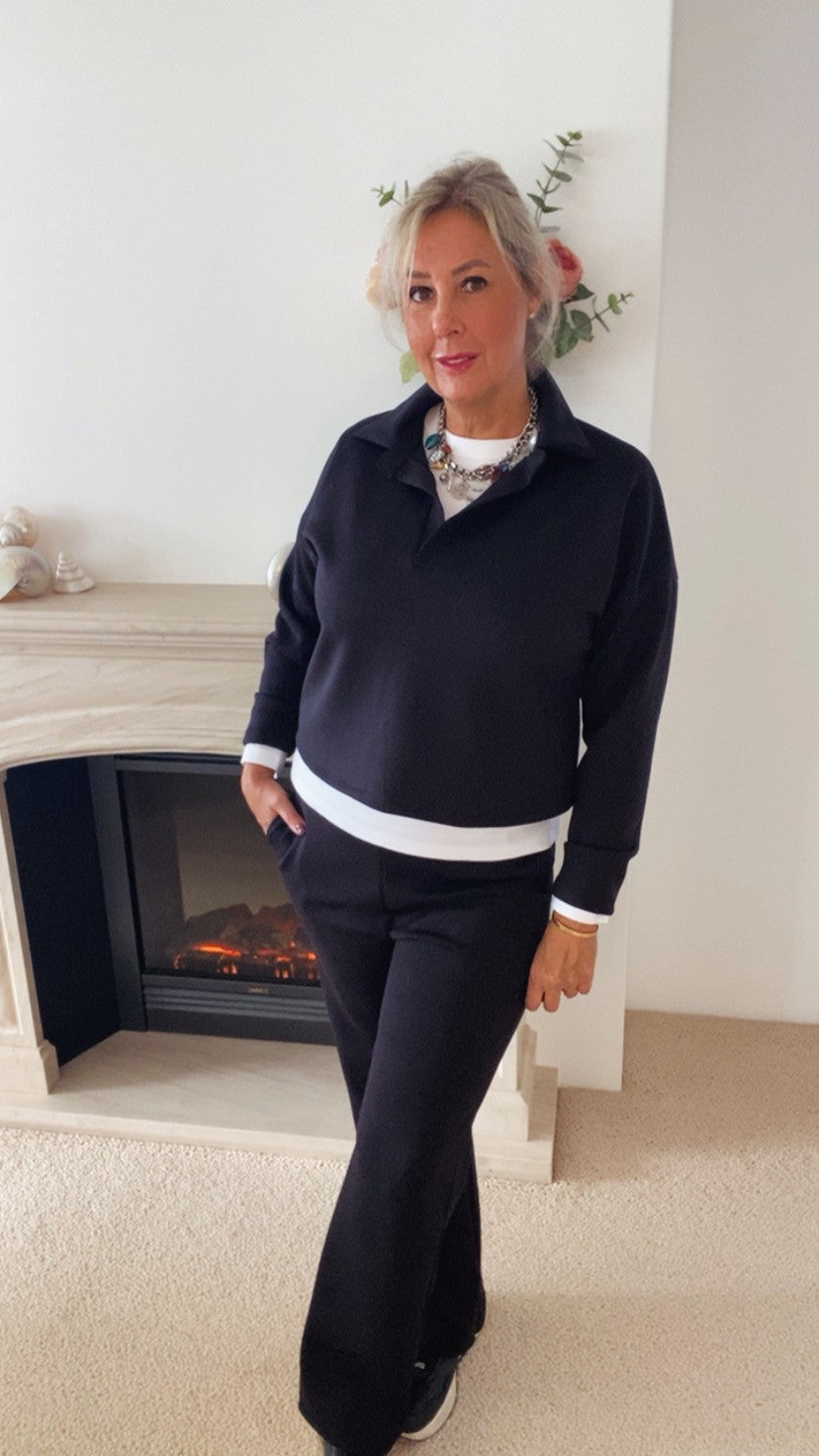 Elegante joggingset in een ultra zachte stof, heerlijk comfortabel om thuis te dragen, maar stijlvol genoeg voor buiten de deur. De sweater heeft lange mouwen en een V-hals. Broek met steekzakken en elastieken band.