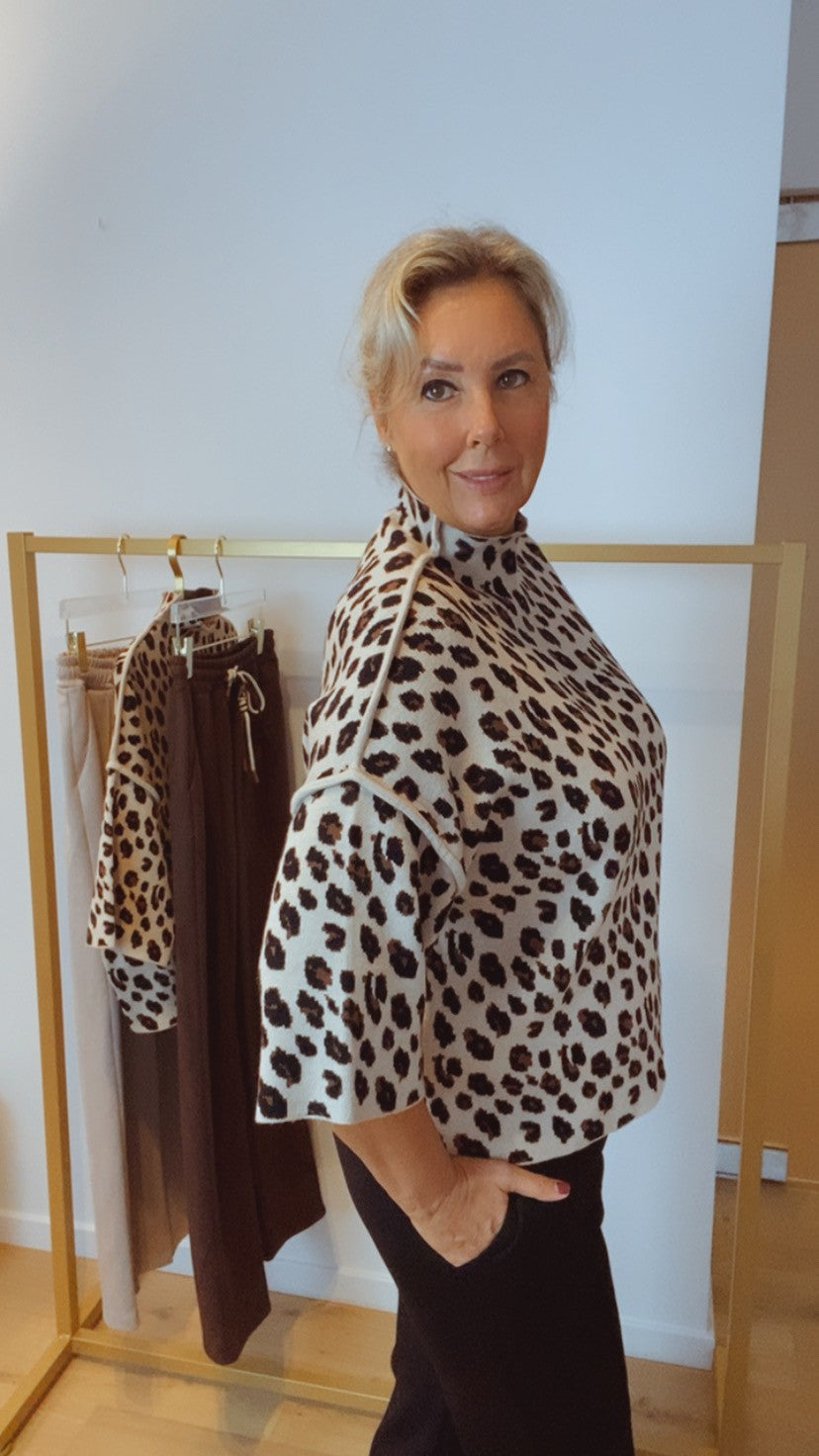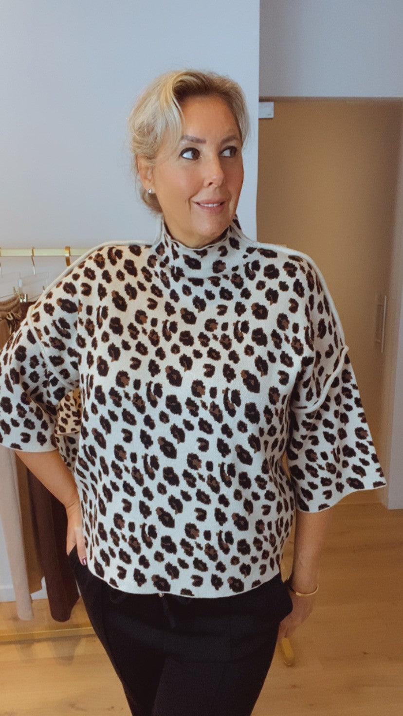 De Leo Sweater is een losvallende sweater met korte mouwen en een all-over leoprint. De rechte fit maken dit een fijne sweater, te combineren met een broek of rok.